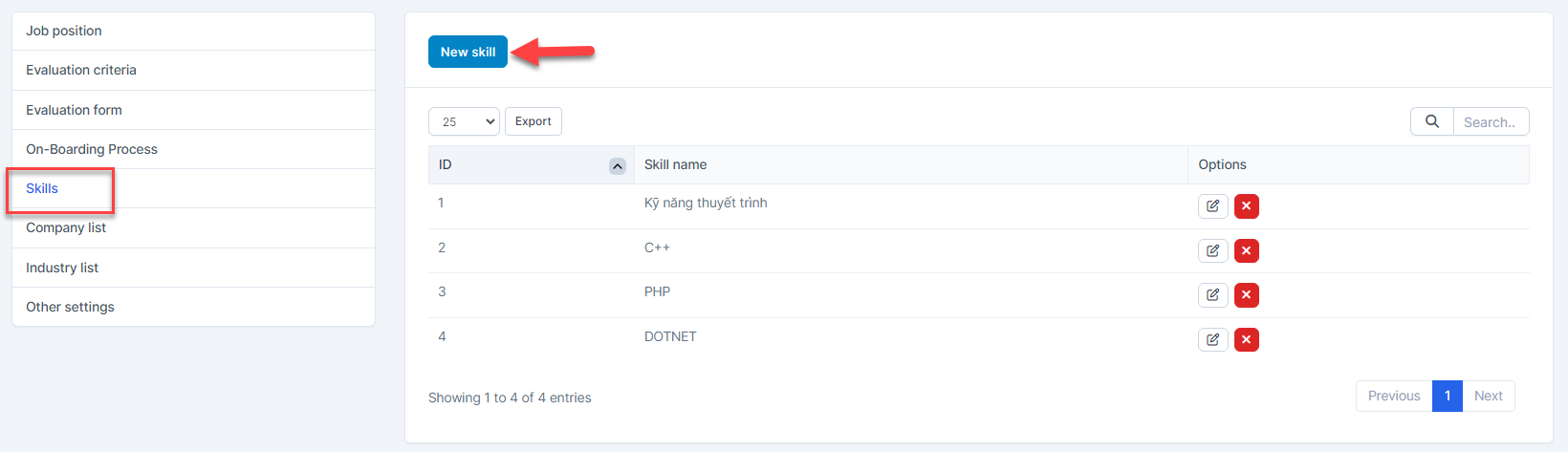 - Step 1. Select the Skills menu -> Select the skill need to be deleted and click Delete button